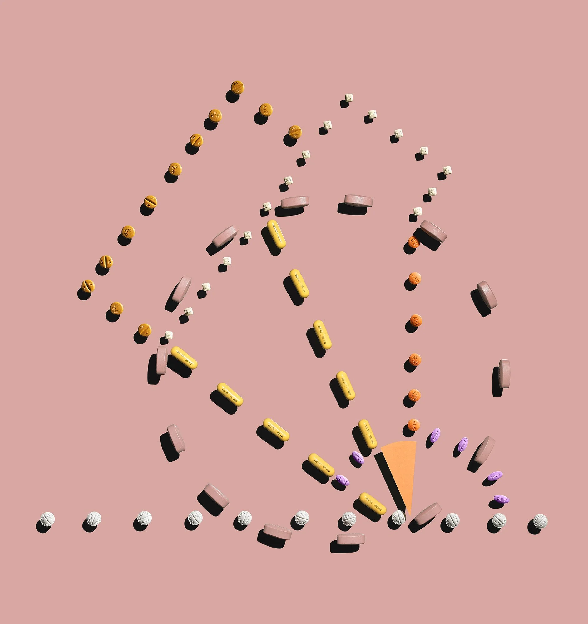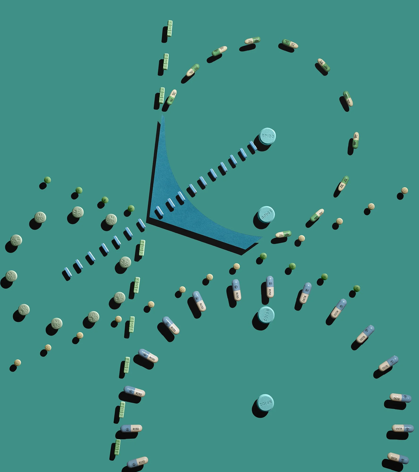 The geometric patterns selected for the designs of the pills are based on mechanical drawings of housing vents and roofing. I was attracted to the circles and going-no-where lines. The shape, texture, and color of the pills are beautiful, seductive, offering the promise of relief. The patterns reflect a particular kind of diagnosis.